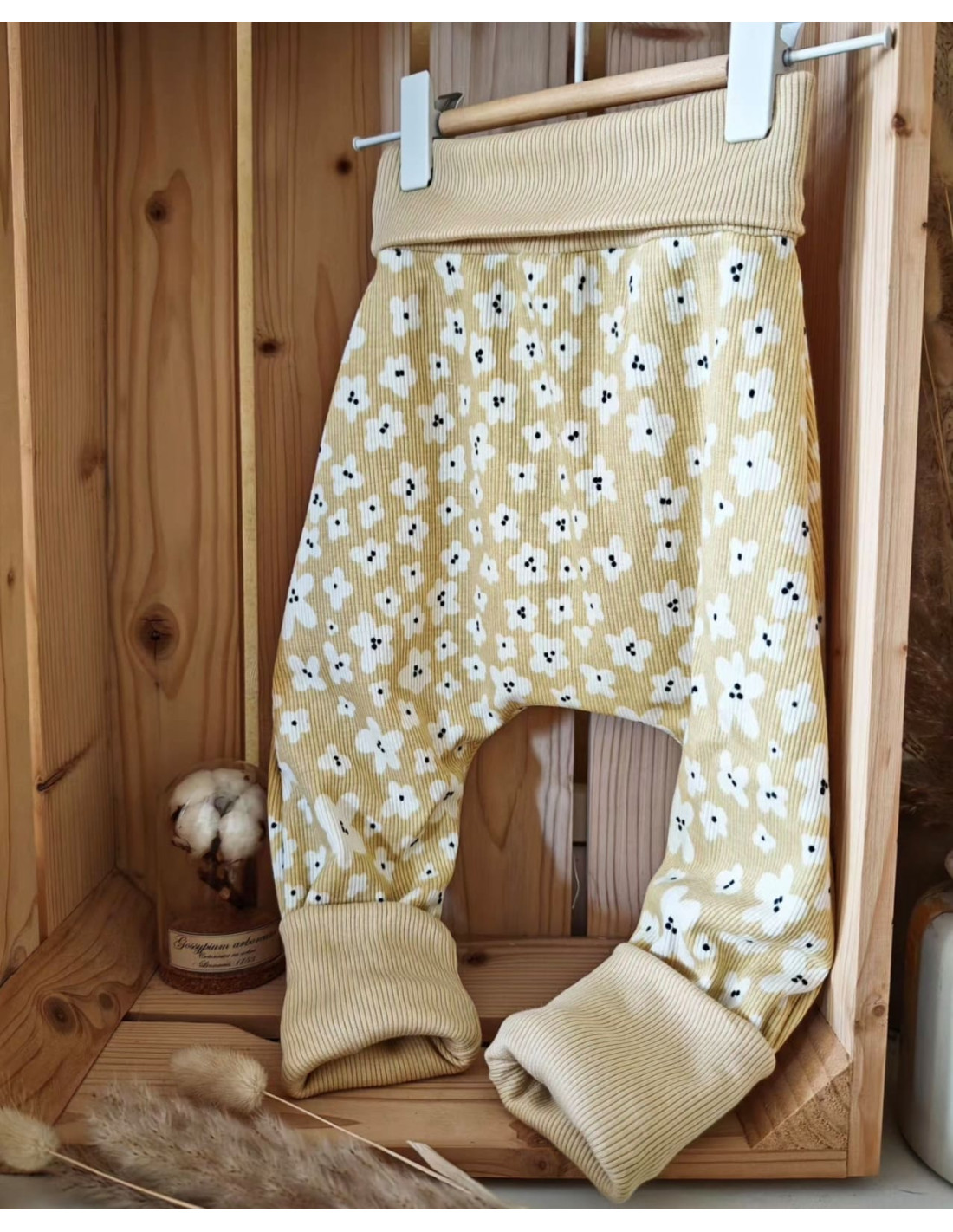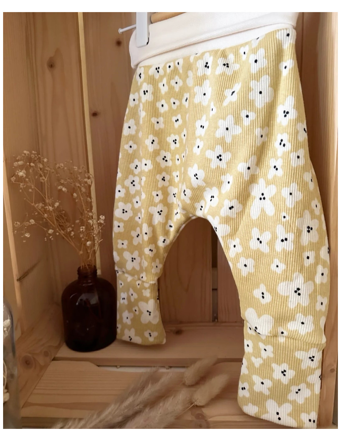 Pantalon évolutif bio - Fleur fond jaune pâle côtelé