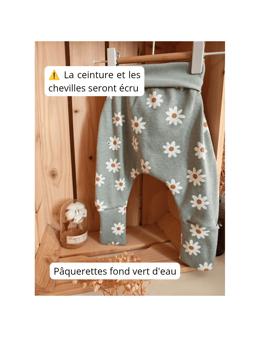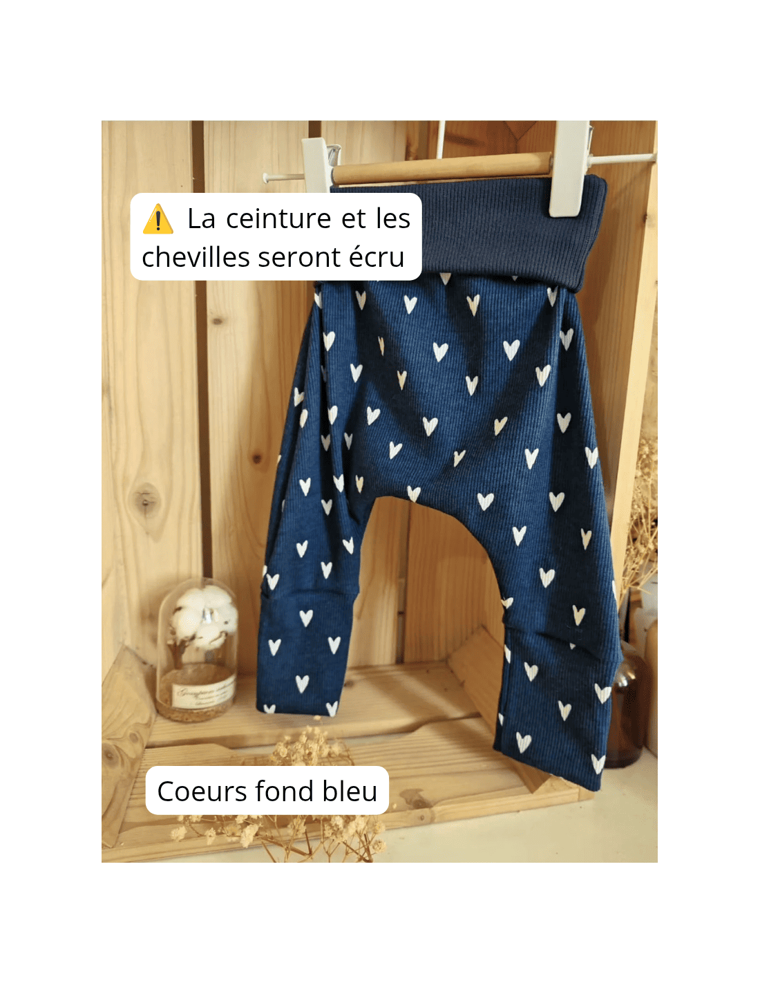Au début, vous repliez les chevilles et la taille. Bébé portera le pantalon ample. Puis au fil des mois, le pantalon s'ajuste et devient legging, vous dépliez les chevilles et la taille petit à petit (vous pouvez aussi laisser la taille dépliée pour tenir leur petit ventre bien au chaud).