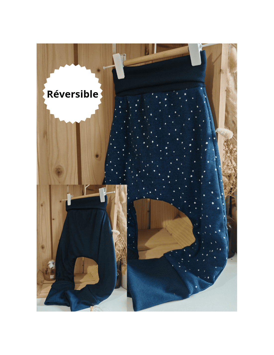 🔥🔥Pantalon réversible & évolutif bio - pois fond bleu & uni bleu côtelé