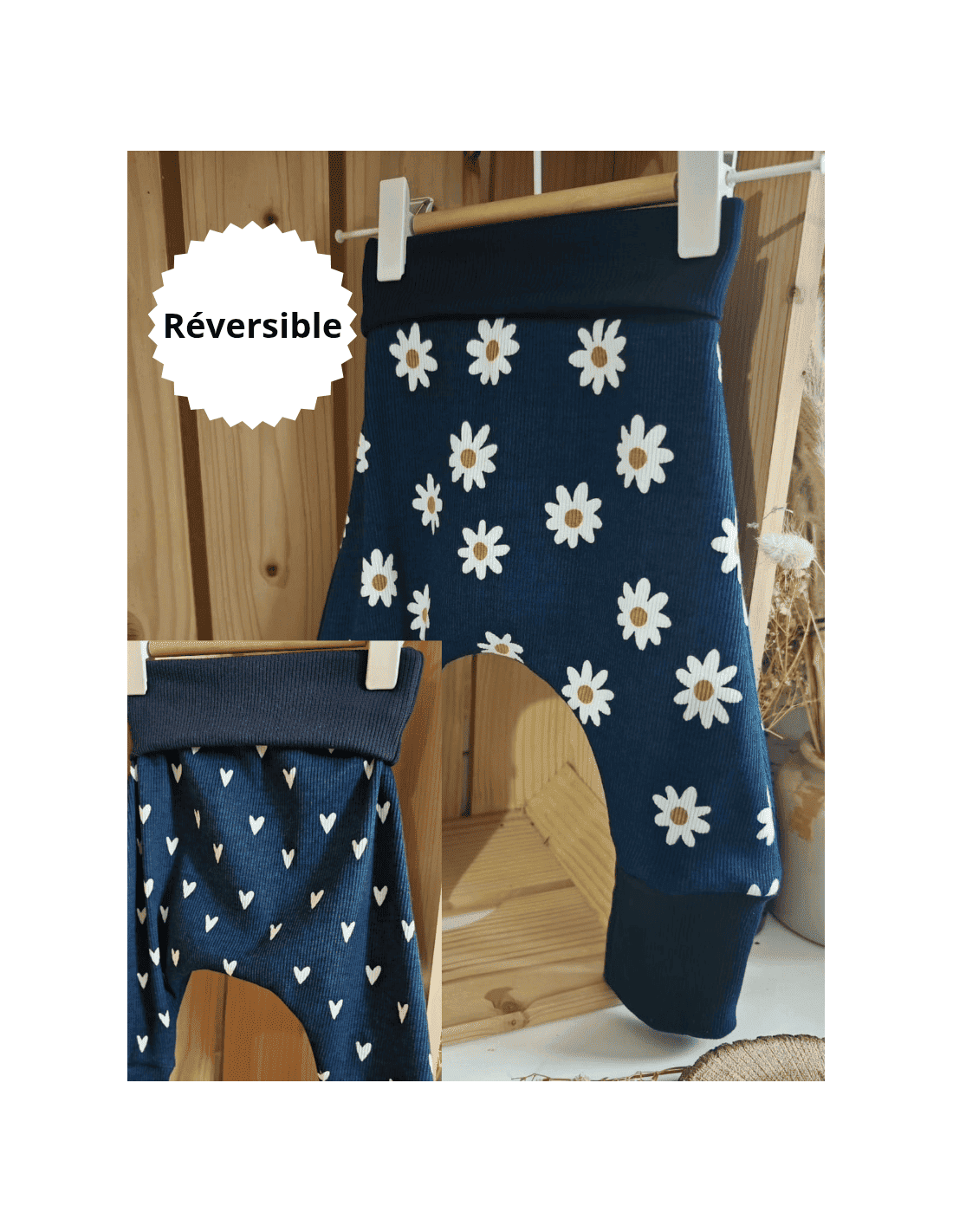 🔥🔥Pantalon réversible & évolutif bio - Pâquerettes & coeurs fond bleu côtelé