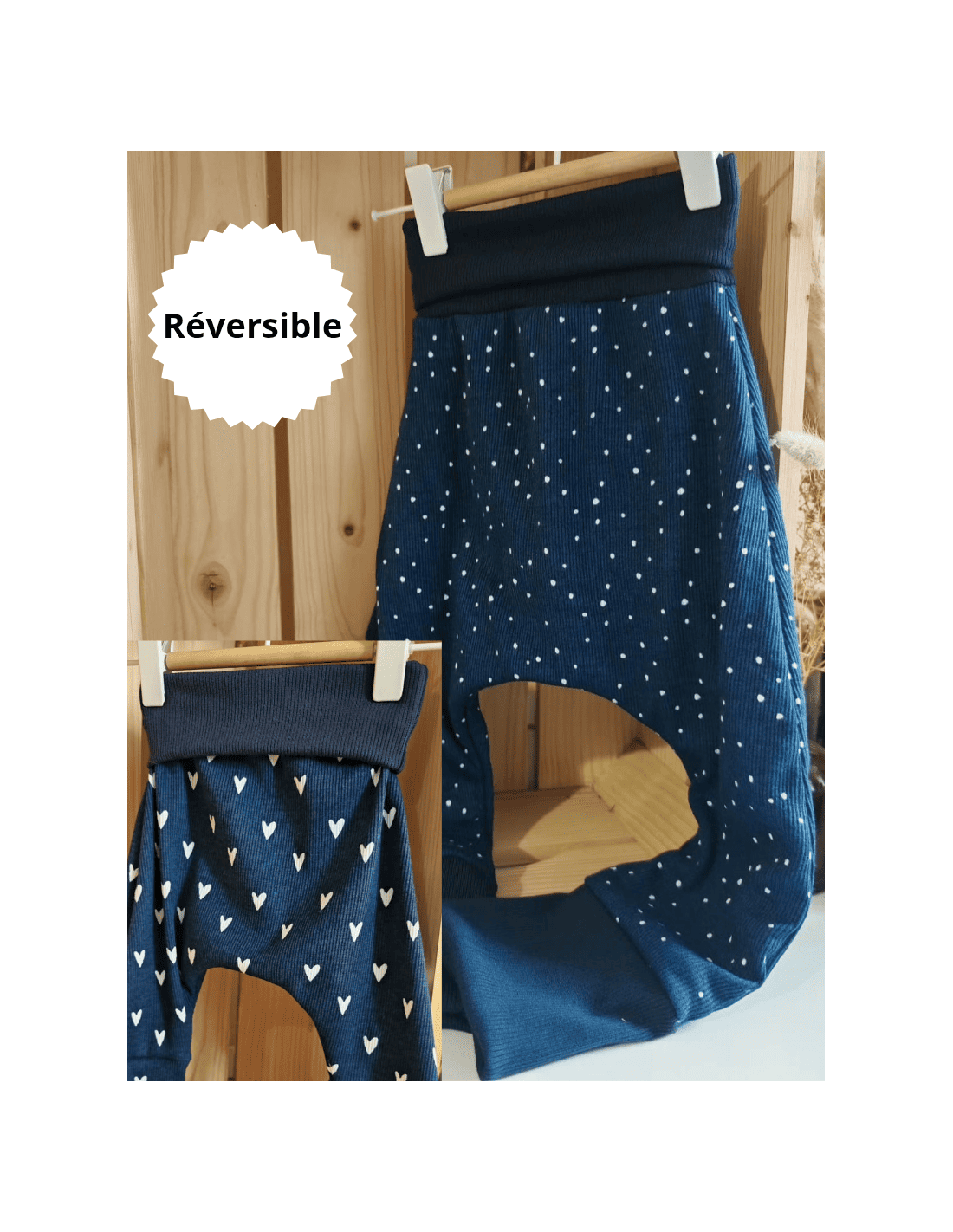 🔥🔥Pantalon réversible & évolutif bio - Coeurs & pois fond bleu côtelé
