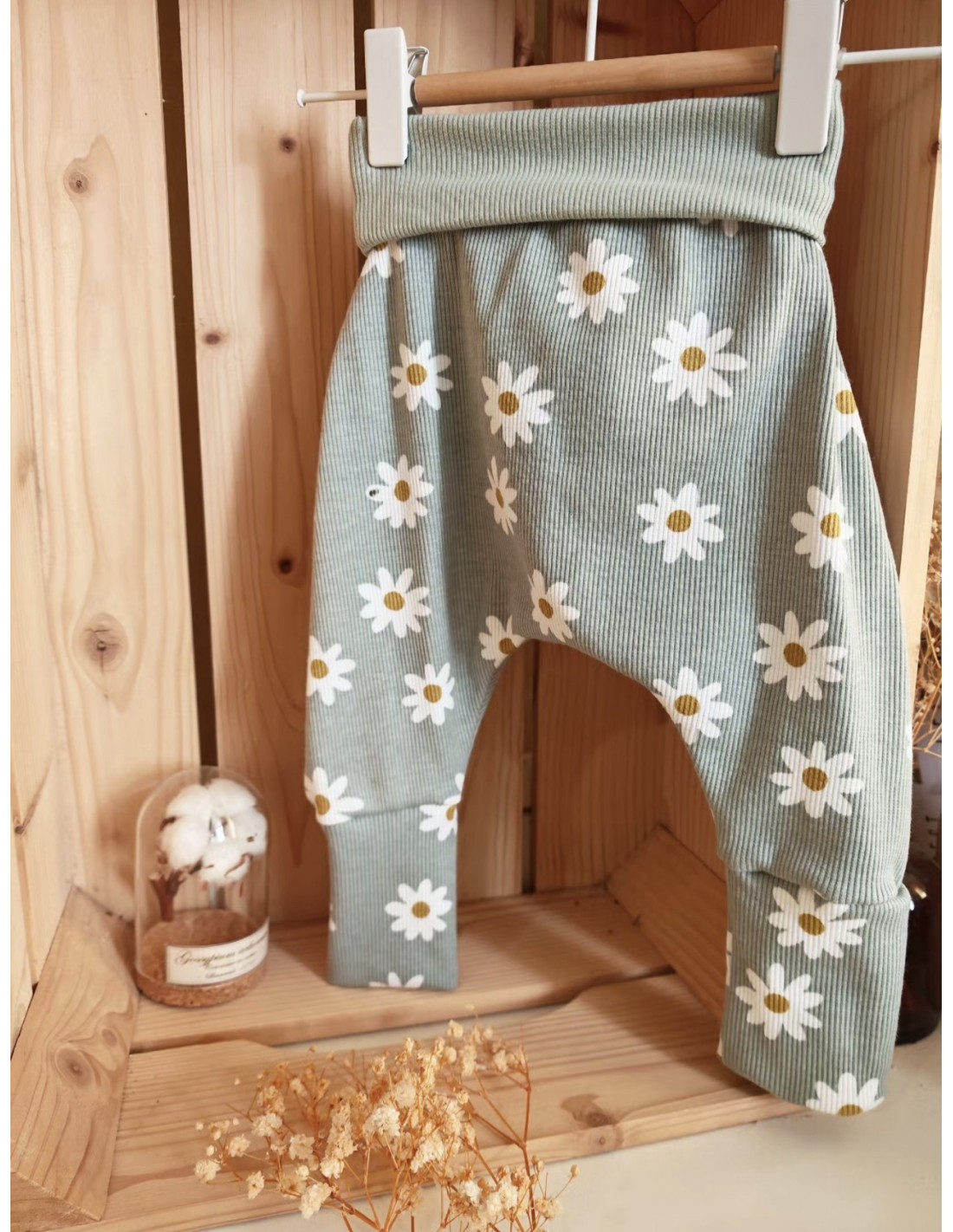 Pantalon évolutif bio - Pâquerettes fond vert d'eau côtelé