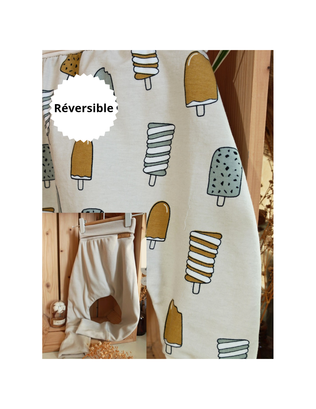 🔥🔥Pantalon réversible & évolutif bio - Glaces & uni beige côtelé