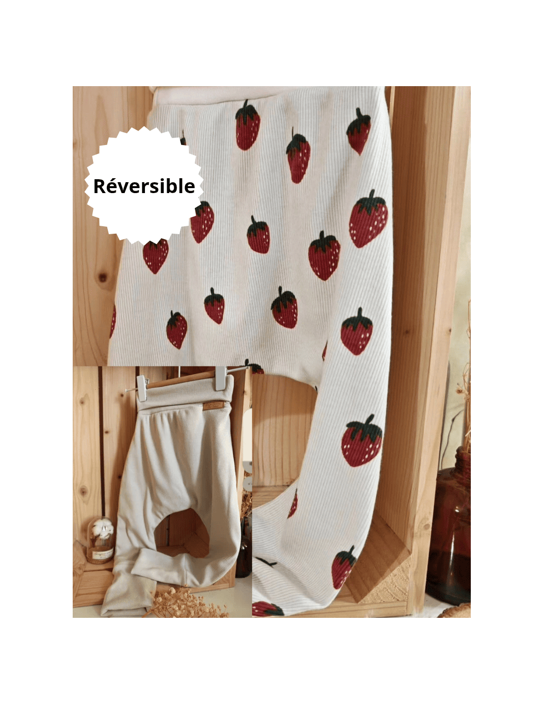 🔥🔥Pantalon réversible & évolutif bio - Fraises & uni beige côtelé