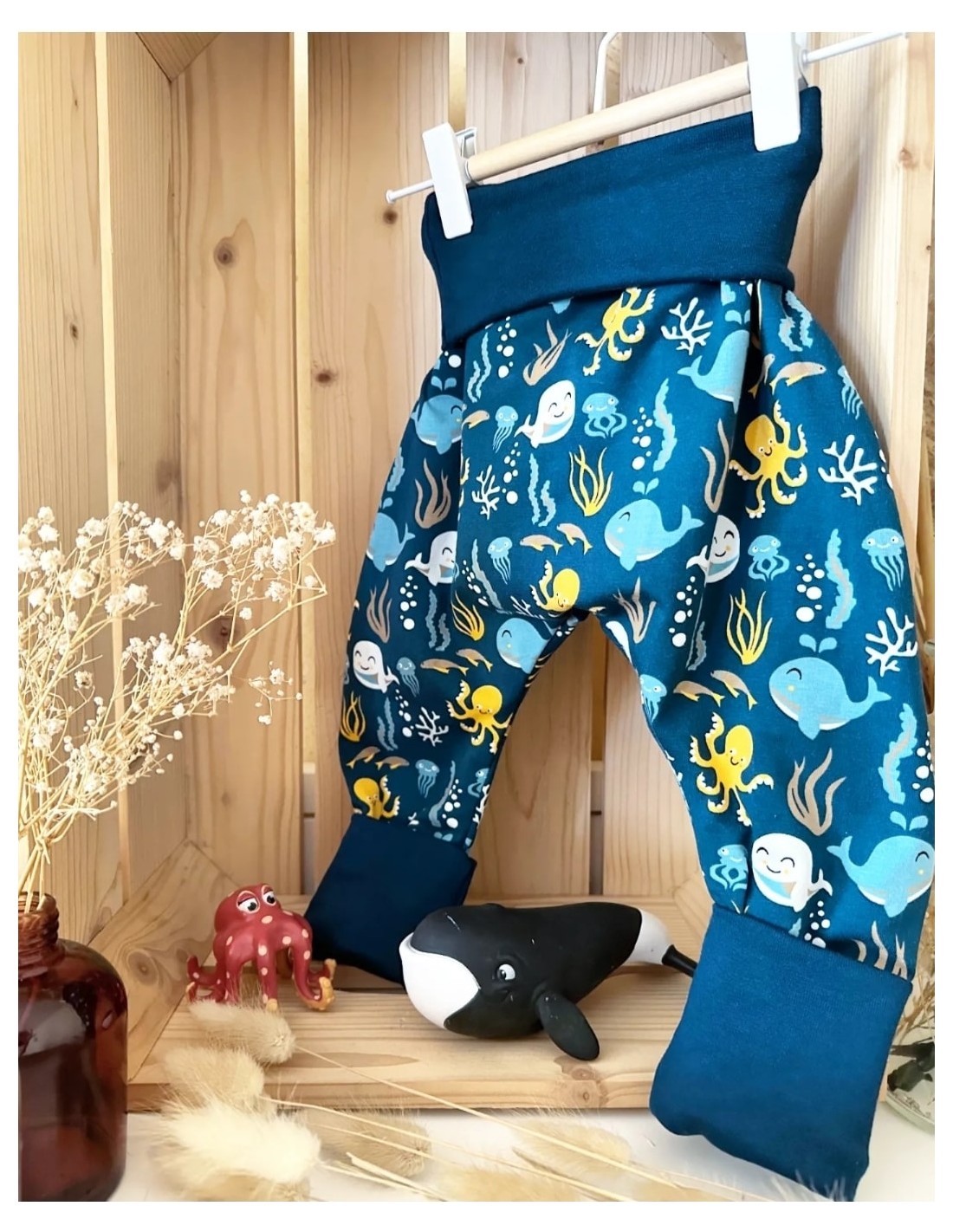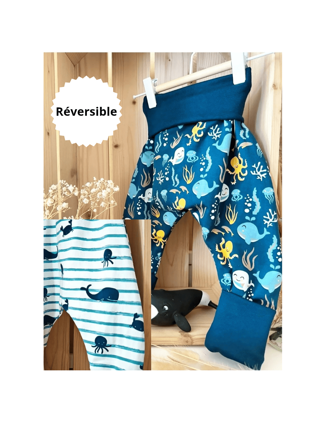 Pantalon évolutif réversible, une face à motifs marinière bleue, une face animaux de la mer. ⚠️Ceinture et chevilles bleu océan sur les 2 faces⚠️